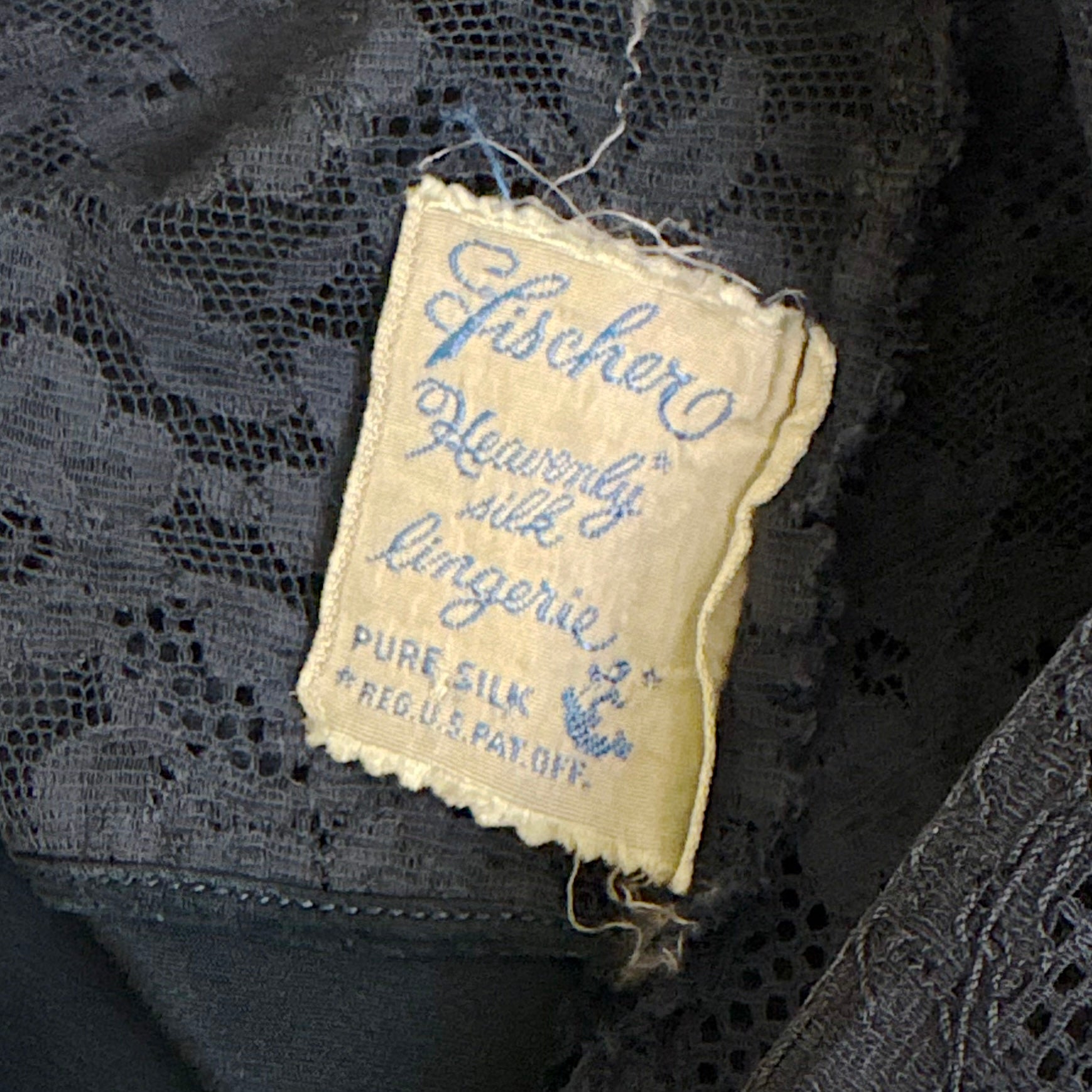 This vintage late 1930s to early 1940s cusp slip by Fischer was made from a very rare deep indigo silk satin material that gives lighter and deeper variants of blue depending on light and movement. A decadent mid-wight fabric that drapes lovingly along the figure. Bias cut with intricate cotton lace that frames the deep V cut neckline that provides a luxurious bit of adornment. Thin adjustable straps with enamel coated metal sliders to provide an always perfect fit. This darling little chemise gently hugs the figure through the upper hip, with a slightly fluted lace edged hem that falls below the knee. A perfect lingerie staple suitable for daily wear as an underpinning or dressing up as a very sexy slip dress.