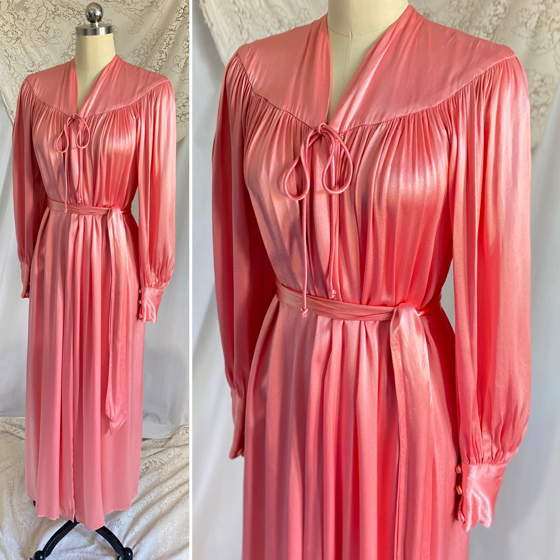 Vintage 1940's Robe | Silky Rose Pink Rayon Satin with Bishop Sleeves | Size S, M, LG | Loungee's