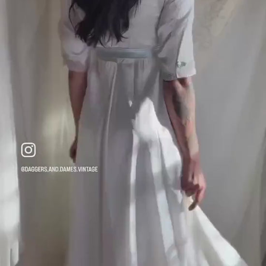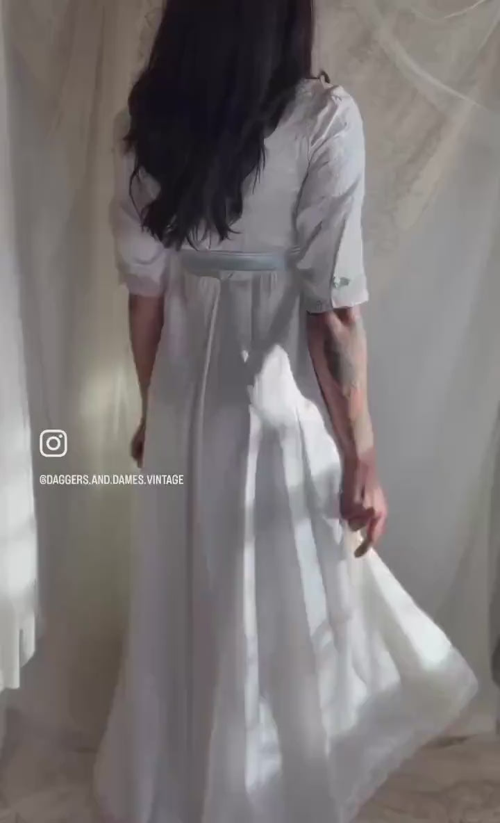 Vintage early 1950s nightgown and robe bridal lingerie set made from silky white rayon satin with heavy embroidered Alençon lace adornments. Both pieces of this stunning set feature a flattering square neck with ruffled lace at the chest which offers a very ethereal feminine allure. A high empire waist on both pieces with the gown having a long cascading nylon chiffon skirt that adds a heavenly amount of body to the set. The robe closes with button snaps and comes with a removeable baby blue ribbon belt, while the gown cinches at the waist with long attached satin ties. A very unique and princess worthy set.