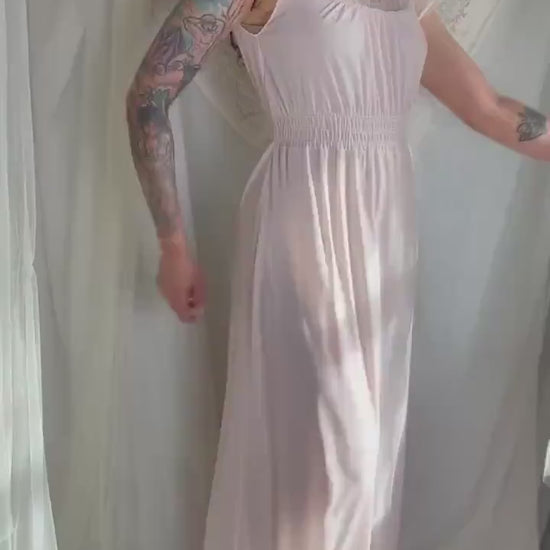 Vintage 1950s nightgown by Binstron made from a silky light rose pink nylon material that hugs the figure nicely. This gown features a sheer tulle insert that covers the upper chest and shoulders edged in satin ribbon. Princess puffed sleeves and the cutest floral appliques at the sides of the chest add a very feminine touch. This darling gown is cinched with a shirred elastic waist to provide a perfectly flatter (and incredibly comfortable) fit. A slim ankle length skirt elongates the figure and adds a touch of elegance. This nightgown easily transforms into outerwear, such a gem!