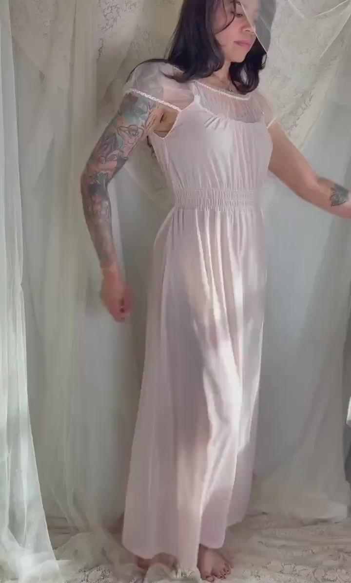 Vintage 1950's Powder Pink Nylon Nightgown with Sheer Tulle & Puffed Sleeves - By Binstron, Size S, M