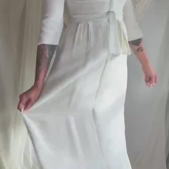 Vintage 1950's robe by Bard's of Toronto made from a silky white rayon velvet with a gorgeous blonde mink collar. Nicely fitted with tailored stitching to provide the classic nipped 'new look' of the 50's. Slender sleeves fall just beyond the elbow, with attached sash ties to cinch the waist to your liking. Fully lined in white rayon satin for a luxurious feel to the skin. This robe falls to the ankle with gathered detail at the hip, and a hidden front zip closure for ease of wear. A very unique and ever so lovely robe made with love by our friends in Canada.